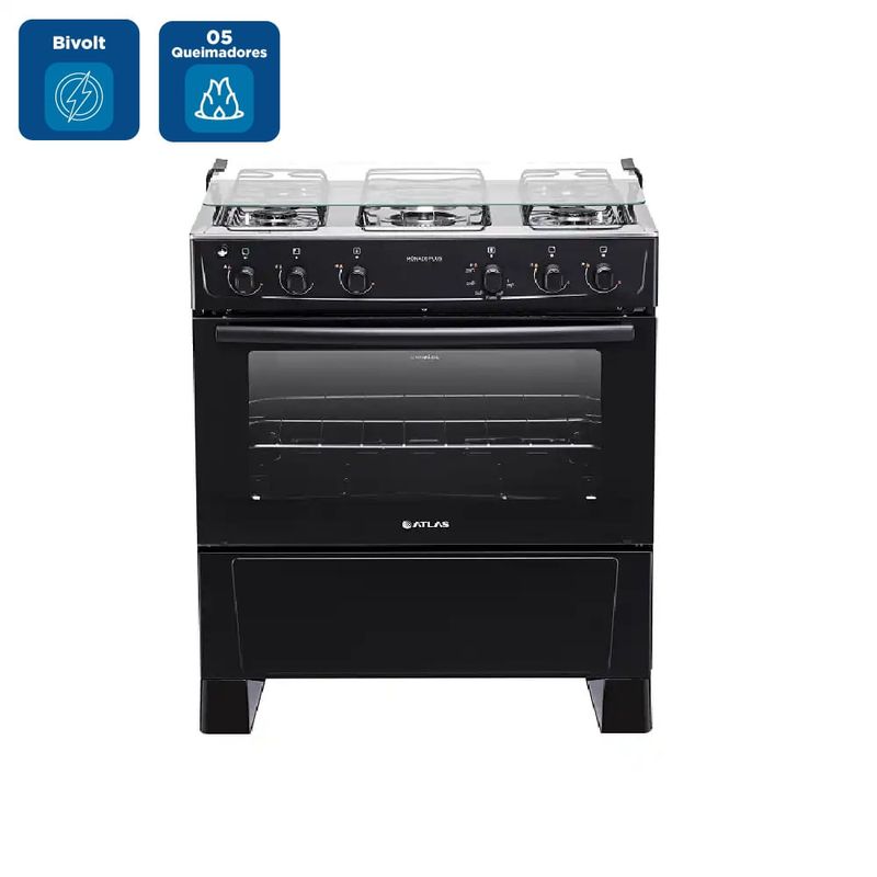 O Fogão De Piso Atlas Monaco Plus 5 Bocas Preto - Bivolt possui mesa em inox, tampa de vidro na mesa, grades duplas de aço esmaltado, acendimento automático e botões removíveis que facilita na hora da limpeza.