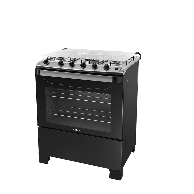 Mesa inox brilhante o e manípulos removíveis para facilitar a limpeza do dia a dia. Revestimento interno do forno limpa-fácil. Duas prateleiras (1 fixa 1 deslizante) e luz do forno blindada. Robusto queimador tripla chama para agilizar o preparo de suas receitas.