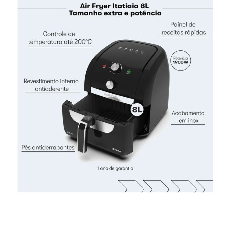 Air Fryer potente e espaçosa, com segurança, estilo e praticidade, o modelo AFITA1003 de 8 litros é a escolha ideal para elevar o nível das suas receitas do dia a dia.