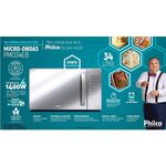 O  Micro-ondas Philco 34 Litros Espelhado Branco PMO34EB  tem pintura Limpa Fácil especial que não permite que a sujeira grude nas paredes internas do micro-ondas, facilitando a limpeza do mesmo.  A tecla Tira Odor é excelente para remoção de cheiro deixado pelo preparo de alimentos no interior do aparelho. Também tem a Função travar e o teclado será bloqueado. Função display que permite apagar o display do produto. Função Display/Sound que desliga o visor, se pressionar e segurar o botão por 3 segundos, o som do teclado desligará e Menu FIT que permite cozinhar batata, sopa e legumes.