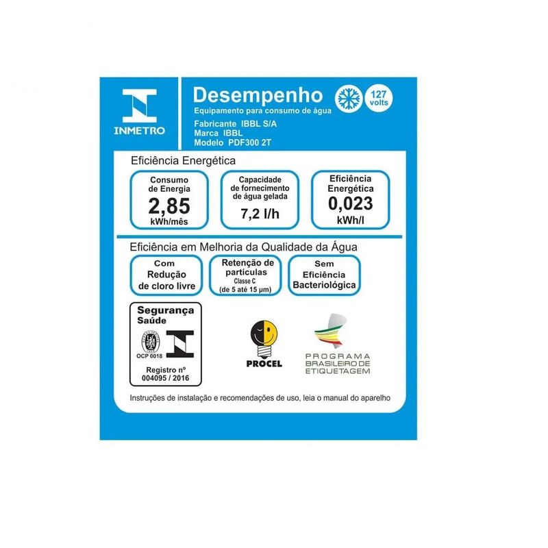 Eficiência energética • Grau de Proteção: IPX4 • Tensão Nominal (V): 127 • Amperagem (A): 2,7 / 1,3 • Potência (W): 185 • Frequência - Mercado Nacional (Hz): 60 • Consumo de Energia (kWh/mês): 2,85 • Eficiência Energética (kW/L): 0,023.