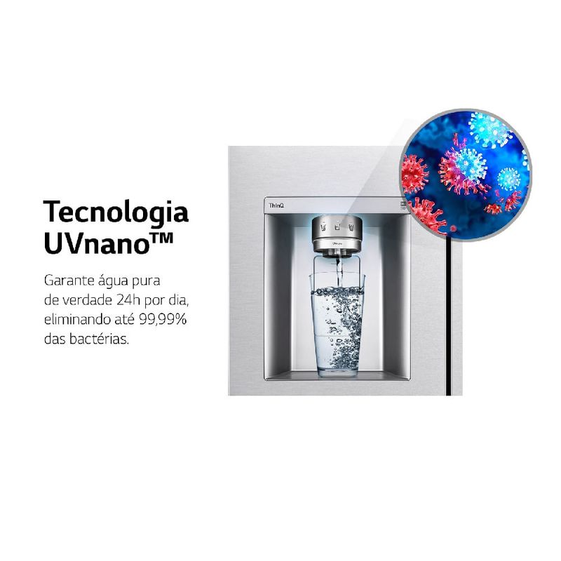 O Refrigerador Smart LG 611 Litros Side by Side Door-in-Door Uvnano Aço Escovado GC-J257CSF1 - 220 Volts possui a tecnologia do Compressor Linear Inverter que garante uma operação muito mais silenciosa e econômica que os compressores convencionais. Com água pura e gelo sempre a disposição.